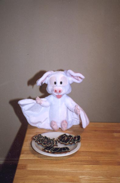 This is a neat stuffed animal Bartok the Bat from the movie 'Anastasia' presiding over a batch of my mom's famous gingerbread Christmas bats!