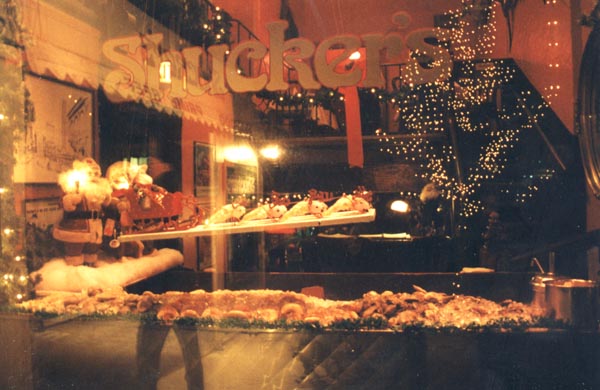 Here is a very cute display in a restaurant window in downtown Chicago featuring a group of shrimp reindeer pulling Santa's sleigh! This would have been taken on December 31, 1997.
