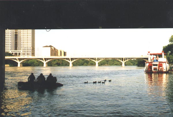 Here is a group of ducks on Lake Austin cruising towards the famous Bat Bridge in downtown Austin. The guys in the raft are a rescue team preparing to save anyone who fell into the river during the July 4th 1997 celebration, since the water was relatively high and fast that day after heavy rains.