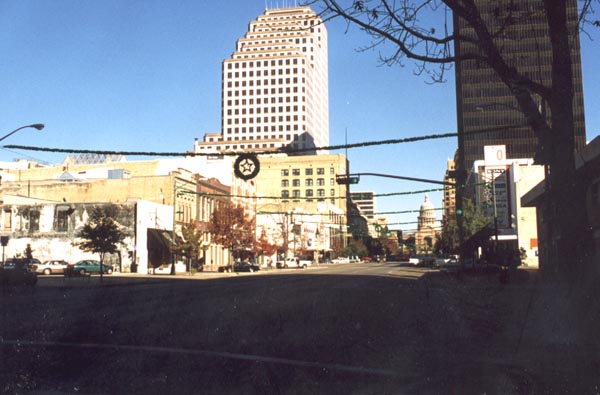 These are the Christmas decorations along Congress Avenue in downtown Austin, Texas, looking north towards the Texas State Capitol. December 1997.