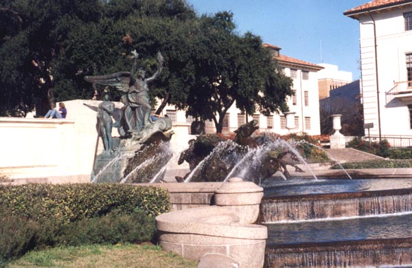 This is an interesting sculpture at the University of Texas in Austin, featuring an aquatic scene of horses that are part fish. I'm not sure what it signifies, especially for landlocked Austin, but it looks neat. February 1998.