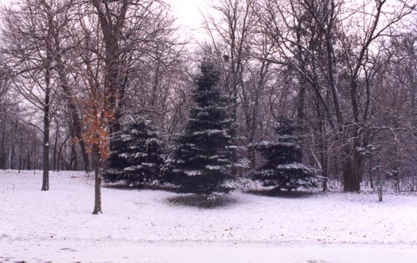 These are some snow-covered trees at a rest stop along the highway that we saw on our trip to Chicago in December 1997.