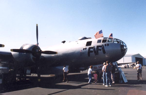 Today's Action Photo is a closeup of the nose section of 'Fifi', a restored B-29 Superfortress bomber on display at Austin's Mueller Airport in April 1998. A group called the Confederate Air Force restored Fifi from a group of B-29s rusting away in a salvage yard in the early seventies, and it is one of the last flyable B-29s still in existence.