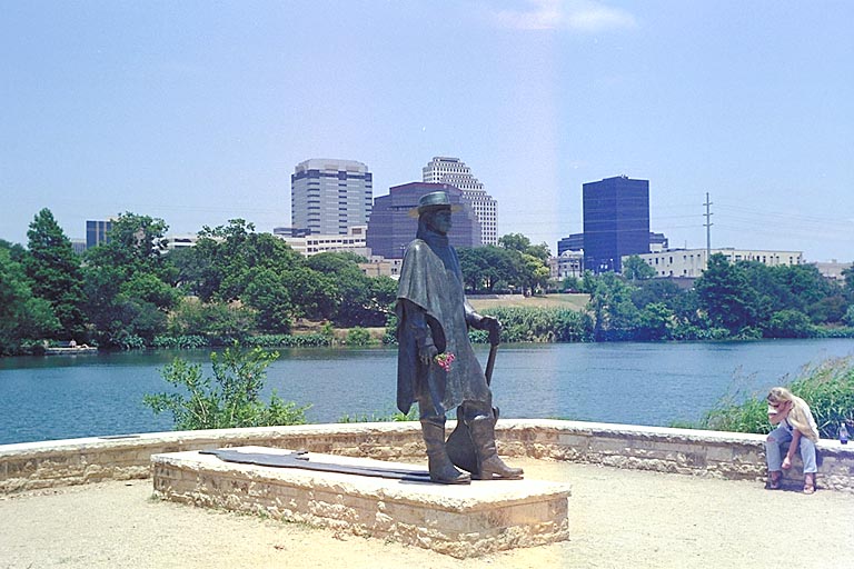 Today's Action Photo is a picture of the statue honoring singer Stevie Ray Vaughn along the shores of Town Lake in downtown Austin, Texas. June 1998.