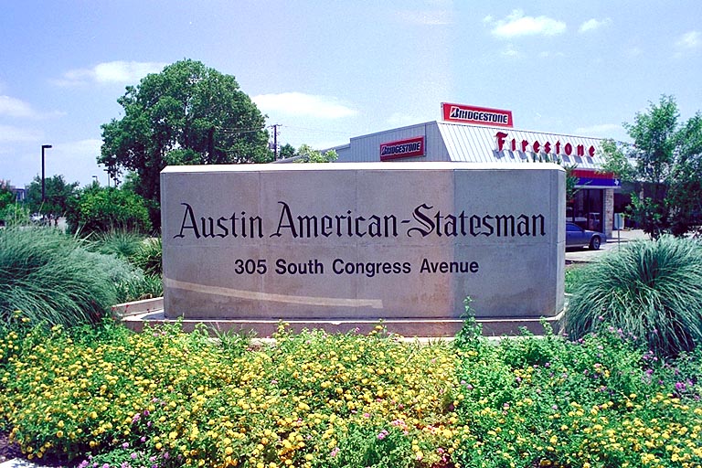 Today's Action Photo is a shot of a big stone plaque marking the home of the Austin American-Statesman, the primary local newspaper of Austin, Texas. June 1998.
