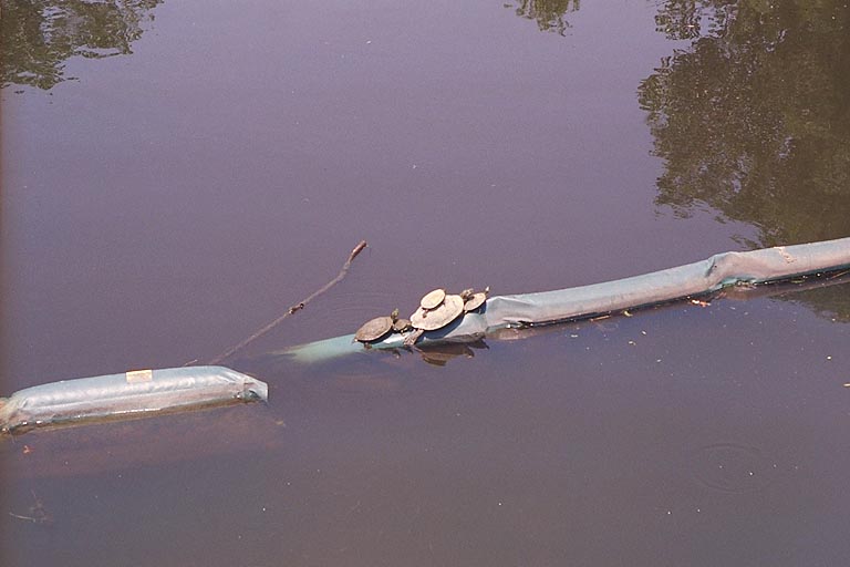 Today's Action Photo is a shot of a mother turtle and her babies sunning themselves along a floating divider in Town Lake in Austin, Texas. May 1998.