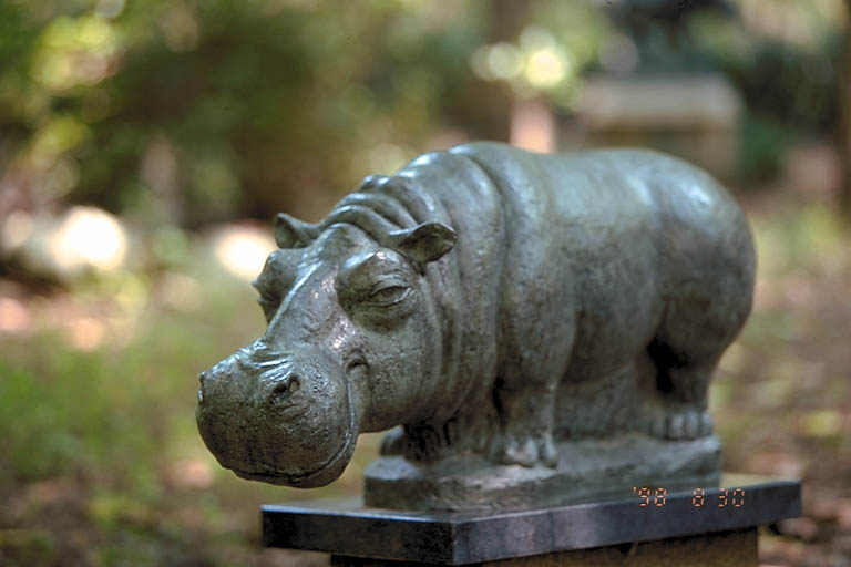 Today's Action Photo is a picture of a sculpture called "Lotus" at the Umlauf Sculpture Garden in Austin, Texas. The brochure says "Lotus" is the Egyptian goddess of fertility, but I'm not sure how that relates to hippopotami. Photo taken with a Canon Elan IIe camera on a Manfrotto Wilderness Tripod, 70-200mm f/2.8L lens, Fuji Sensia II film. Exposure settings were 1/30 second at f/2.8 with +1/2 stop of exposure compensation. Photo CD scan done by Dale Laboratories of Hollywood, Florida.