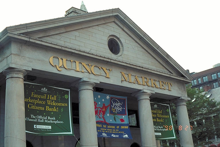 Today's Action Photo is a picture of Quincy Market, an interesting shopping area that has existed in downtown Boston, Massachusetts, for over two hundred years. Photo taken with a handheld Canon Elan IIe camera, 50mm f/1.8 lens, Kodak Royal Gold 400 film. Exposure settings were 1/250 second at f/5.6 with +1/2 stop of exposure compensation.