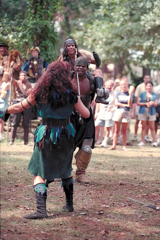 Today's Action Photo is a picture of barbarians fighting at the Texas Renaissance Festival. Here Kiva Fyrewulf takes refuge on the back of Sholo the Nubian as a fire-haired warrior woman attacks! Photo taken with a handheld Canon Elan IIe camera, 70-200mm f/2.8L lens with a B+W multicoated UV filter, Fuji Superia 400 film.