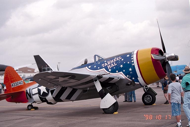 Today's Action Photo is a picture of a customized World War II fighter plane (a P-47 Thunderbolt, I think) painted up for "Tarheel Hal", apparently the plane's pilot. Photo taken with a handheld Canon Elan IIe camera, 70-200mm f/2.8L lens with a B+W multicoated UV filter, Kodak Royal Gold 100 film. Exposure settings were 1/2000 second at f/2.8 with +1/2 stop of exposure compensation.