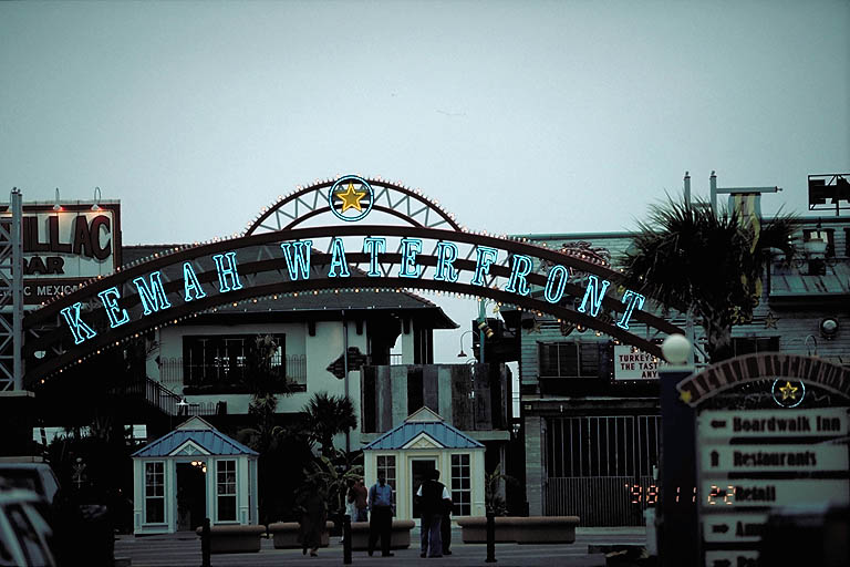 Today's Action Photo is a shot of the entrance sign along the Kemah Waterfront, a little section of nice seafood restaurants, in Kemah, Texas, near Houston. Photo taken with a Canon Elan IIe camera on a Manfrotto Wilderness Tripod, 70-200mm f/2.8L lens, Fuji Velvia film. Exposure settings were 1/250 second at f/2.8.