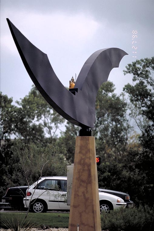 Today's Action Photo is a picture of Austin's famous bat sculpture showing its first signs of aging with some cracking finish around the base. Compare the weathered base here to the brand new sculpture of only a few months ago. Photo taken with a Canon Elan IIe camera on a Manfrotto Wilderness Tripod, 70-200mm f/2.8L lens, Fuji Astia 100 film. 1/1000 second at f/2.8.