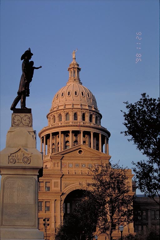 Today's Action Photo is a picture of the Texas State Capitol with a statue celebrating volunteer firemen in the foreground. Photo taken with a Canon Elan IIe camera on a Manfrotto Wilderness Tripod, 70-200mm f/2.8L lens, Fuji Astia 100 film. Exposure settings were 1/20 second at f/13.