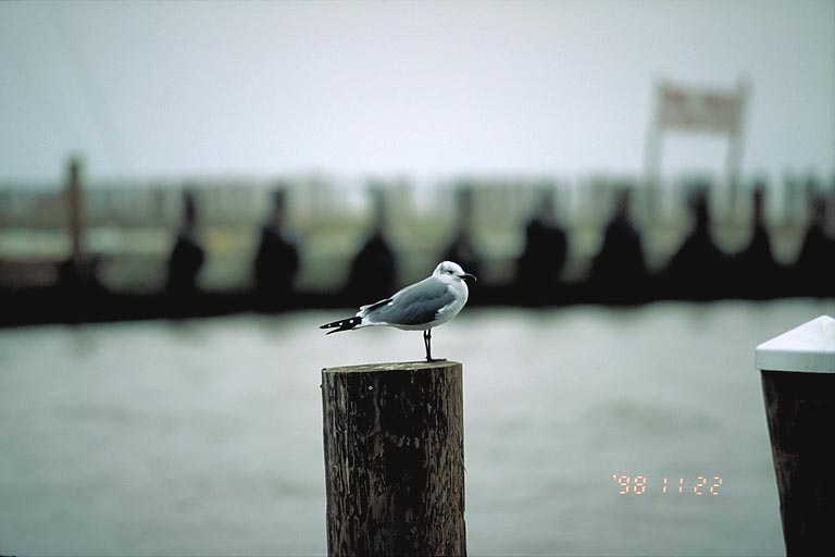 Today's Action Photo is a picture of a seagull standing on a pier at the Kemah Waterfront near Houston, Texas. Photo taken with a Canon Elan IIe camera on a Manfrotto Wilderness Tripod, 70-200mm f/2.8L lens, Fuji Velvia film. 1/180 second at f/2.8.