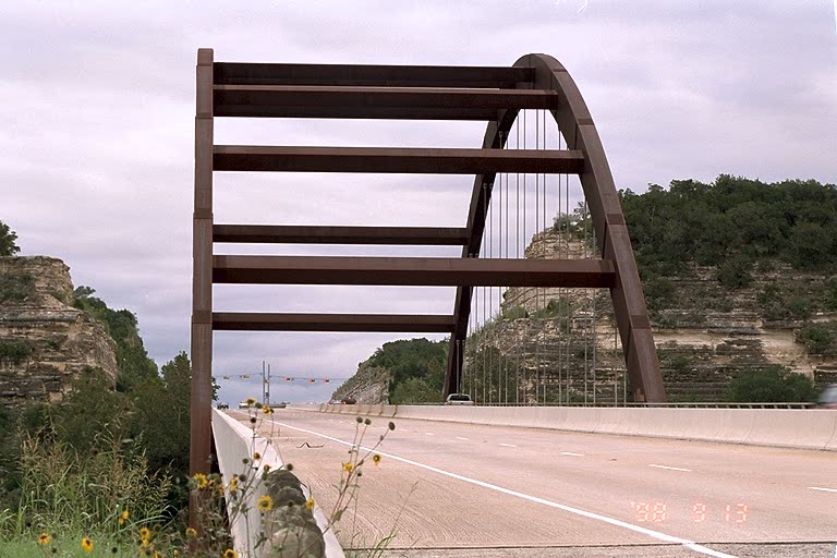 Today's Action Photo is a picture of Austin's famous Pennybacker Bridge, also called the Loop 360 Bridge, spanning Lake Austin west of the city. This is standing at the southern edge of the bridge facing north up Loop 360. Photo taken with a Canon Elan IIe camera on a Manfrotto Wilderness Tripod, 70-200mm f/2.8L lens, Kodak Royal Gold 100 film. Exposure settings were 1/20 second at f/16 with +1/2 stop of exposure compensation.