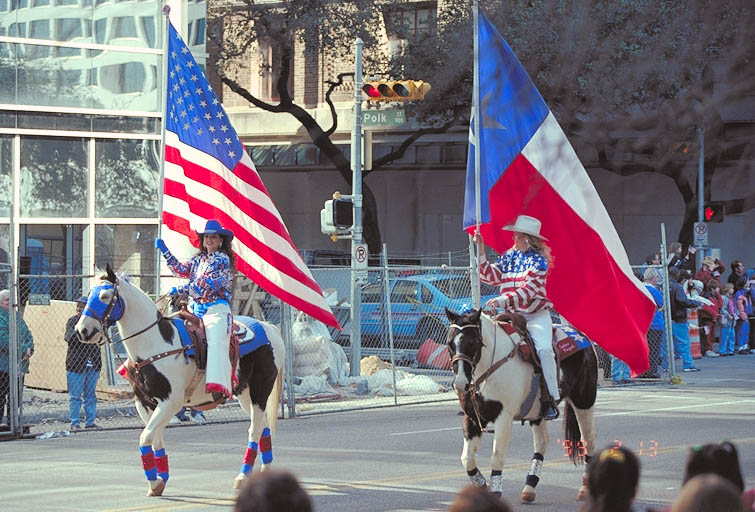 Today's Action Photo is a picture of flag-bearing riders in the Houston Livestock Show and Rodeo parade in downtown Houston, Texas. Photo taken with a handheld Canon Elan IIe camera, 70-200mm f/2.8L lens with a B+W multicoated UV filter, Kodak Royal Gold 400 film. Exposure settings were 1/500 second at f/4. Photo CD scan done by Advanced Digital Imaging of Fort Collins, Colorado.