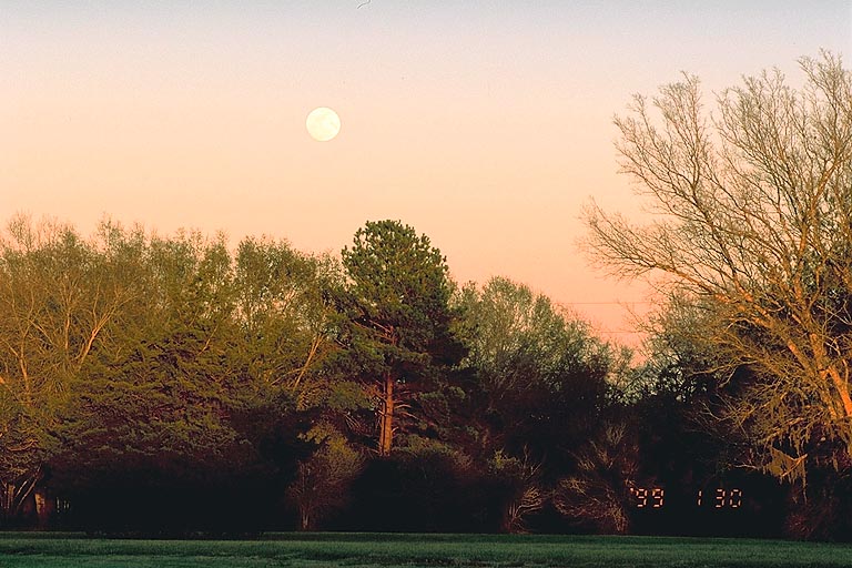 Today's Action Photo is a picture of the Moon over a little park on Eldridge Parkway in west Houston, Texas. Photo taken with a Canon Elan IIe camera on a Manfrotto Wilderness Tripod, 70-200mm f/2.8L lens with a B+W multicoated UV filter, Fuji Velvia film. Exposure settings were 1/6 second at f/16 with +1/2 stop of exposure compensation.