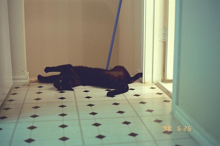 Today's Action Photo is a picture of my cat Bartok looking backwards from his favorite upside-down position on the kitchen floor. Photo taken with a handheld Canon Elan IIe camera, 50mm f/1.8 lens, Kodak Royal Gold 400 film.