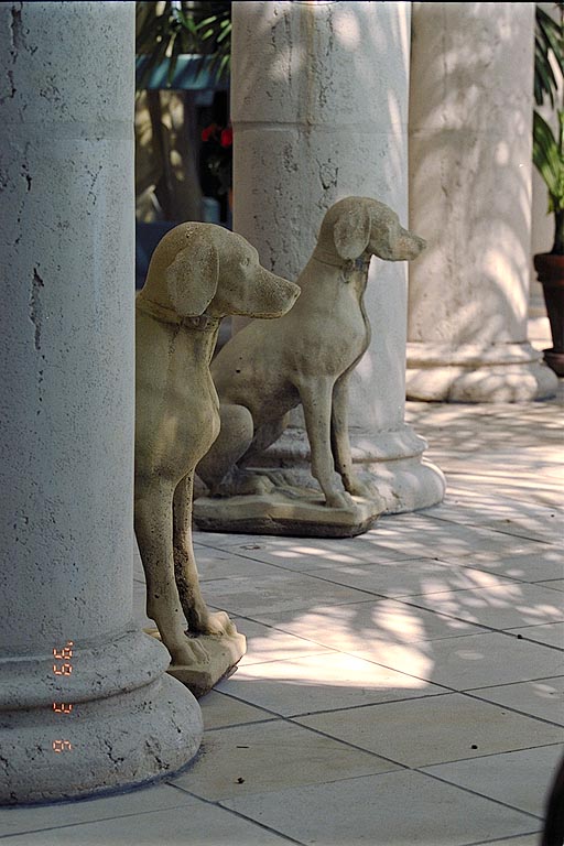 Today's Action Photo is a picture of a pair of interesting dog statues overlooking the interior pool of a house along the Azalea Trail in the River Oaks area of Houston, Texas. Photo taken with a handheld Canon Elan IIe camera, 70-200mm f/2.8L lens with a multicoated B+W UV filter, Kodak Portra 400VC film. Exposure settings were 1/180 second at f/8 with +1/2 stop of exposure compensation.