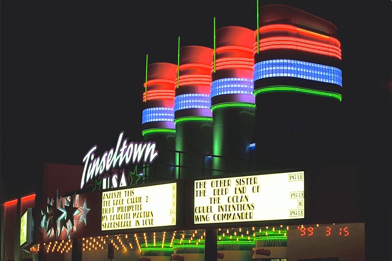 Today's Action Photo is a picture of the Wing Commander Movie on the marquee at Tinseltown in Houston, Texas. Photo taken with a Canon Elan IIe camera on a Manfrotto Wilderness Tripod, 70-200mm f/2.8L lens with a multicoated B+W UV filter, Kodak Royal Gold 100 film. Exposure settings were 7/10 second at f/8 with +1/2 stop of exposure compensation.