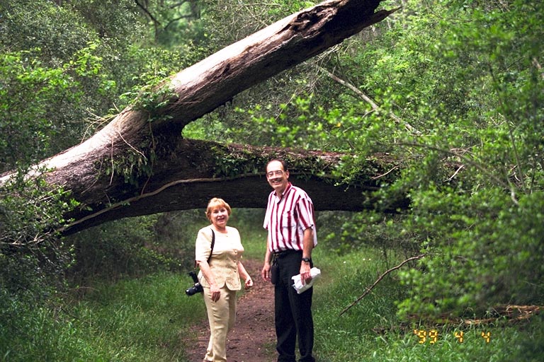 Today's Action Photo is a picture of my Mom and Dad next to a fallen tree on a trail at Brazos Bend State Park near Houston, Texas. Photo taken with a handheld Canon Elan IIe camera, 70-200mm f/2.8L lens, Kodak Gold MAX 800 film.