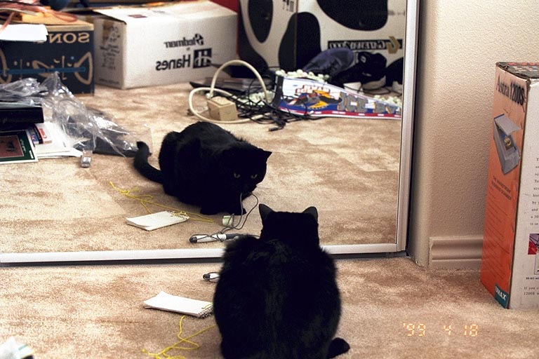 Today's Action Photo is one more shot of my cat Bartok discovering his reflection in a mirror in my apartment in Houston, Texas. Photo taken with a Canon Elan IIe camera on a Manfrotto Wilderness Tripod, 70-200mm f/2.8L lens, Kodak Gold MAX 800 film. Exposure settings were 1/30 second at f/5.6 with +1/2 stop of exposure compensation.