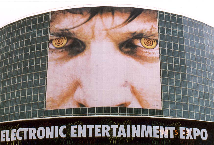 Today's Action Photo is a picture of the main sign outside the exhibit hall for the big 1999 video game E3 show in Los Angeles, California. Photo taken with a handheld Canon Elan IIe camera, 70-200mm f/2.8L lens. Kodak Gold Max 800 film.