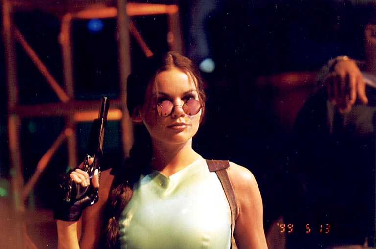 Today's Action Photo is a picture of a model playing the part of video game star Lara Croft at the Eidos Interactive booth at the 1999 E3 video game show in Los Angeles. Photo taken with a handheld Canon Elan IIe camera, 70-200mm f/2.8L lens. Kodak Gold Max 800 film.
