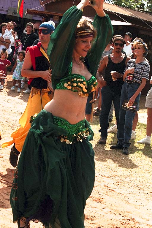 Today's Action Photo is a picture of a green belly dancer twisting through the streets of the Texas Renaissance Festival! Photo taken with a handheld Canon Elan IIe camera, 70-200mm f/2.8L lens.