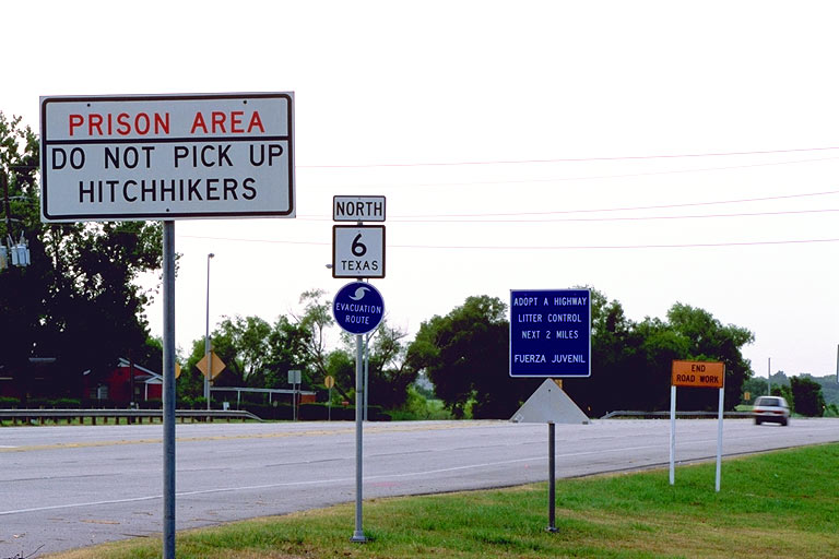 Today's Action Photo is a picture of an interesting row of advisory signs along Highway 6 in Sugar Land, Texas! Photo taken with a Canon Elan IIe camera and a 70-200mm f/2.8L lens on a Manfrotto 3221W tripod, Fuji Velvia film.
