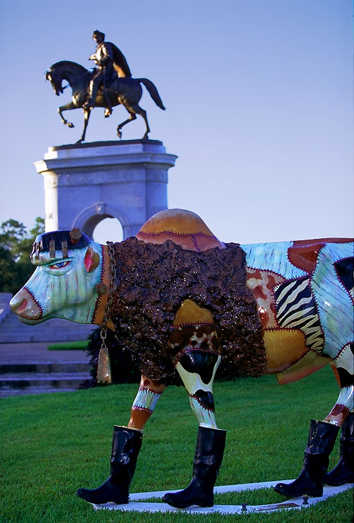 Today's Action Photo is a picture of a Houston Cow Parade cow named "Boris Cowloff" on display in front of the Sam Houston Statue in the Museum District of Houston, Texas! Artist: Dan Dunn's Caricatures Ink, Patron: CowParade Houston 2001. Photo taken with a Canon Elan IIe camera on a Manfrotto 3221W tripod, Fuji Velvia film.