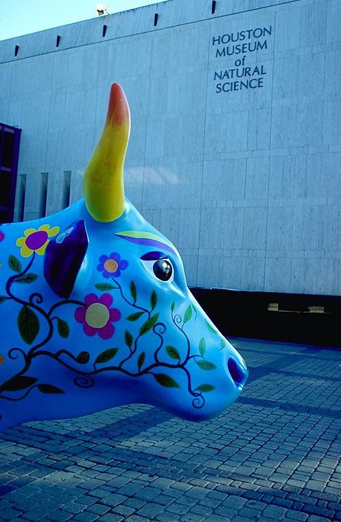 Today's Action Photo is a picture of a Houston Cow Parade cow named "Moo-Earth Cow" on display in front of the Houston Museum of Natural Science in Houston, Texas! Artist: Fu Te-Jui (Kyle) Patron: Harriet and Joe Foster. Photo taken with a Canon Elan IIe camera and a 20-35mm f/3.5-4.5 lens with a circular polarizer on a Manfrotto 3221W tripod, Fuji Velvia film.
