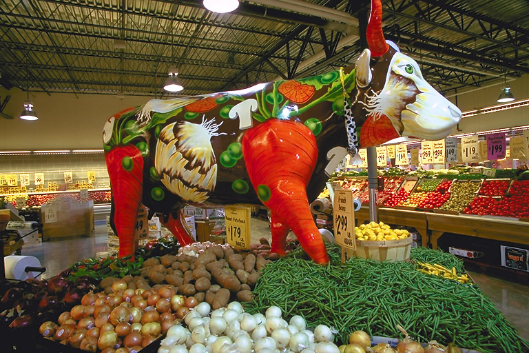 Today's Action Photo is a picture of a Houston Cow Parade cow named "Beef Stew" on display inside the Central Market gourmet grocery store in Houston, Texas! Photo taken with a Canon Elan IIe camera on a Manfrotto 3221W tripod, 20-35mm f/3.5-4.5 lens, Fuji Velvia film.