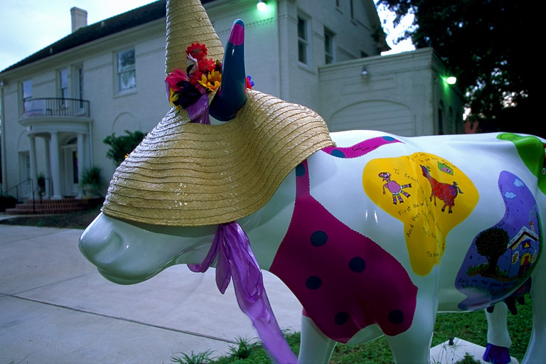 Today's Action Photo is a picture of a Houston Cow Parade cow named "Mother Moose", whose hat was apparently overcome by heavy rain, on display at the Joy School in the museum district of Houston, Texas! Artist: Eva Felder. Patron: Judy and Frank Lee and family. Photo taken with a Canon Elan IIe camera and a 20-35mm f/3.5-4.5 lens with Fuji Velvia film, 1/3 second at f/3.5 with flash.