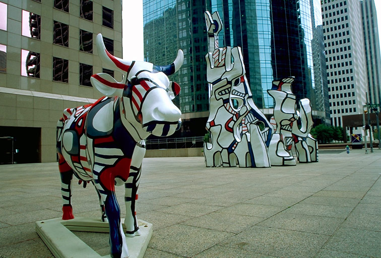Today's Action Photo is a picture of a Houston Cow Parade cow named "Mootif" cleverly juxtaposed with a sculpture of similar design in downtown Houston, Texas! Artist: Carlo Macaione of Gensler. Patron:  Trione & Gordon and Gensler Cow-Conspirators. Photo taken with a Canon Elan IIe camera and a 20-35mm f/3.5-4.5 lens with Fuji Velvia film, 1 second at f/11.