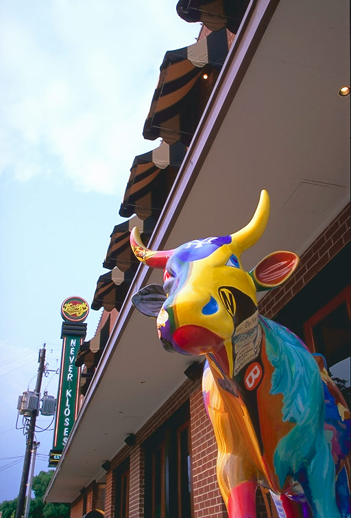 Today's Action Photo is a picture of a Houston Cow Parade cow named "Deli-cow-tessen" on display outside Katz's Deli in the Montrose district of Houston, Texas! Artist: Bonnie Lambourn. Patron: Katz's Deli. Photo taken with a Canon Elan IIe camera and a 20-35mm f/3.5-4.5 lens with Fuji Velvia film, 1/2 second at f/16.