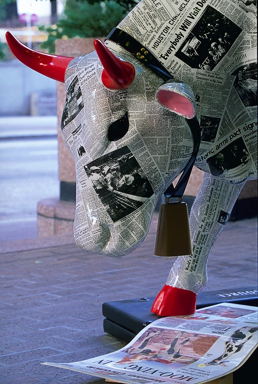 Today's Action Photo is a picture of a Houston Cow Parade cow named "Houston Chronicow" on display outside the Houston Chronicle newspaper office in downtown Houston, Texas! Artist: Kellye Sanford and Terry Rountree. Patron: Houston Chronicle. Photo taken with a Canon Elan IIe camera and a 20-35mm f/3.5-4.5 lens with Fuji Velvia film, 2 seconds at f/8.
