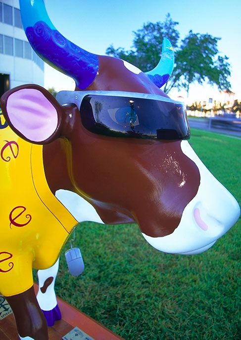 Today's Action Photo is a picture of a Houston Cow Parade cow named "E-cow" on display along Allen Parkway in Houston, Texas! Photo taken with a Canon Elan IIe camera, 20-35mm f/3.5-4.5 lens with Fuji Velvia film, 1/3 second at F4, flash with warming filter.