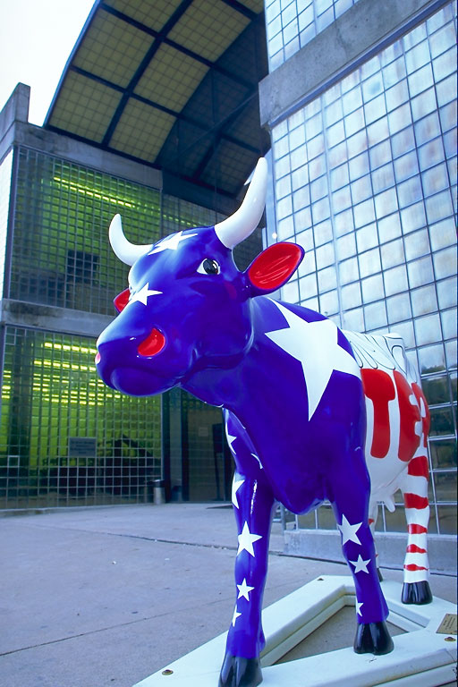 Today's Action Photo is a picture of a Houston Cow Parade cow named "Half-and-Half" on display in the museum district of Houston, Texas! Photo taken with a Canon Elan IIe camera, 20-35mm f/3.5-4.5 lens with Fuji Velvia film, 4 seconds at F8, flash with warming filter.