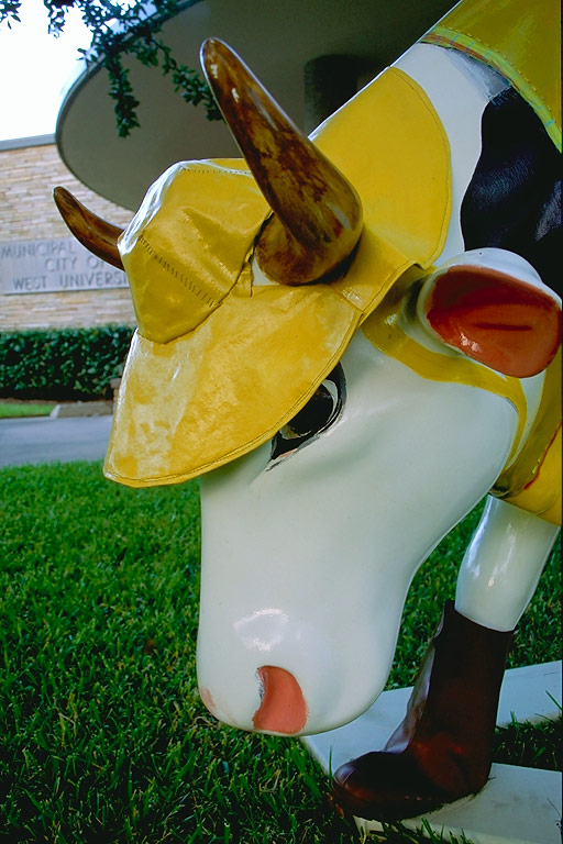 Today's Action Photo is a picture of "Moonsoon - Raining Cats and Dogs", in front of the West University Place City Hall near Houston, Texas, as part of the Houston Cow Parade! Artist: Holly Lewis and Caroline Graham. Patron: City of West University Place. Photo taken with a Canon Elan IIe camera, 20-35mm f/3.5-4.5 lens, Fuji Velvia film, 7/10 second at f/8.