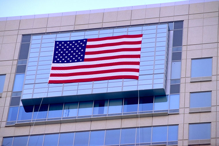 Today's Action Photo is a picture of a big American flag displayed on the side of a building along Beltway 8 in Houston, Texas, in honor of the people who died in the September 11 incident. Photo taken with a Canon Elan IIe camera, 70-200mm f/2.8L lens, Fuji Velvia film, 1/15 at f/5.6.