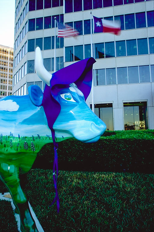 Today's Action Photo is a picture of a Houston Cow Parade cow called 'Moo-bonnets' on display along Allen Parkway in Houston, Texas! Artist: Casey and Michael Farris, Bridgett Vallery. Patron: American General. Photo taken with a Canon Elan IIe camera, 20-35mm f/3.5-4.5 lens, Fuji Velvia film. 7/10 second at f/16.