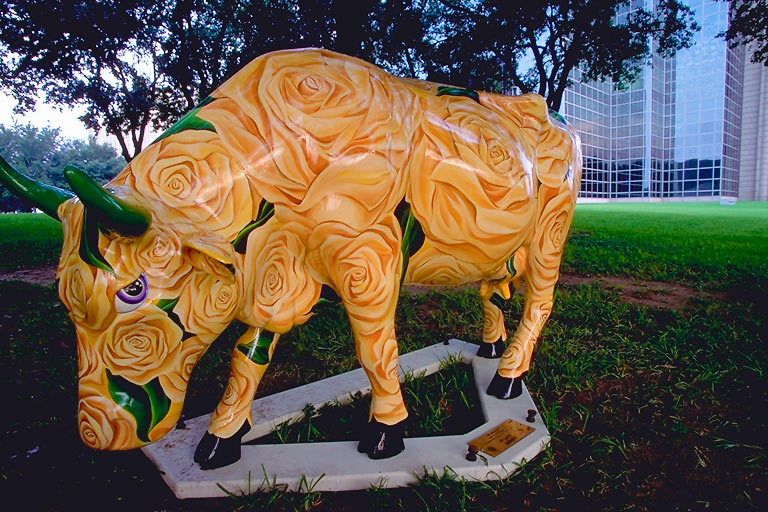 Today's Action Photo is a picture of a Houston Cow Parade cow named "Yellow Rose" on display outside Williams Tower in Houston, Texas! Artist: Candida Bayer. Patron: Mike Bonini, Meg Goodman. Photo taken with a Canon Elan IIe camera, 20-35mm f/3.5-4.5 lens, Fuji Velvia film.