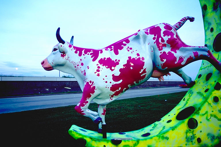Today's Action Photo is a picture of a Houston Cow Parade cow named "Over the Moon" on display along Beltway 8 in Houston, Texas! Artist: Lucy Wiley, JuicyLucyStudio.com. Patron: GHBA Benefit Homes Project. Photo taken with a Canon Elan IIe camera, Fuji Velvia film.