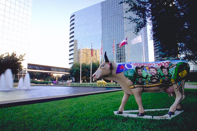 Today's Action Photo is a picture of a Houston Cow Parade cow named "Q-Morning Moo" on display in Greenway Plaza in Houston, Texas! Artist: Nextwave Art, David C. James. Patron: The New 93Q. Photo taken with a Canon Elan IIe camera, Fuji Velvia film.