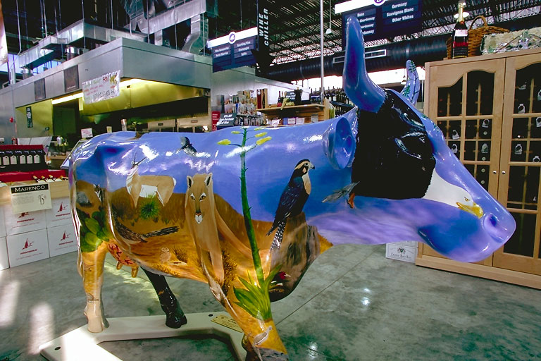 Today's Action Photo is a picture of a Houston Cow Parade cow named "Texas Wildlife" on display inside HEB Central Market in Houston, Texas! Artist: T. Colleen Letchford. Patron: HEB Grocery Company. Photo taken with a Canon Elan IIe camera, Fuji Velvia film.