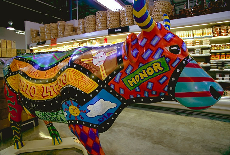 Today's Action Photo is a picture of a Houston Cow Parade cow named "Livin' La Vaca Loca" on display inside HEB Central Market in Houston, Texas! Artist: Georges Le Chevallier. Patron: H-E-B Grocery Company. Photo taken with a Canon Elan IIe camera, 20-35mm f/3.5-4.5 lens, Fuji Velvia film.
