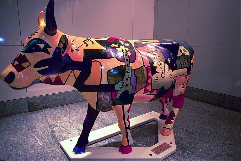 Today's Action Photo is a picture of a Houston Cow Parade cow named "Picowso's Moosicians" on display inside Reliant Plaza in downtown Houston, Texas! Artist: Clear Lake High School. Patron: Reliant Energy. Photo taken with a Canon Elan IIe camera, 20-35mm f/3.5-4.5 lens, Fuji Velvia film.