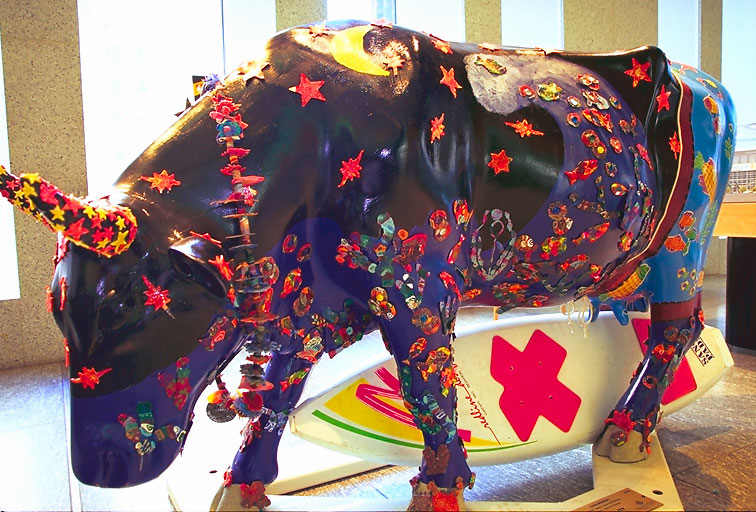 Today's Action Photo is a picture of a Houston Cow Parade cow named "Cowabunga!" on display inside Reliant Plaza in downtown Houston, Texas! Artist: Valley Oaks Elementary. Patron: Reliant Energy.