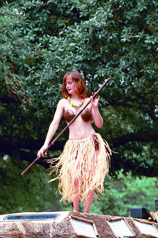 Today's Action Photo is a picture of a hula dancer performing atop a bamboo-themed entry in the Houston Art Car Parade!